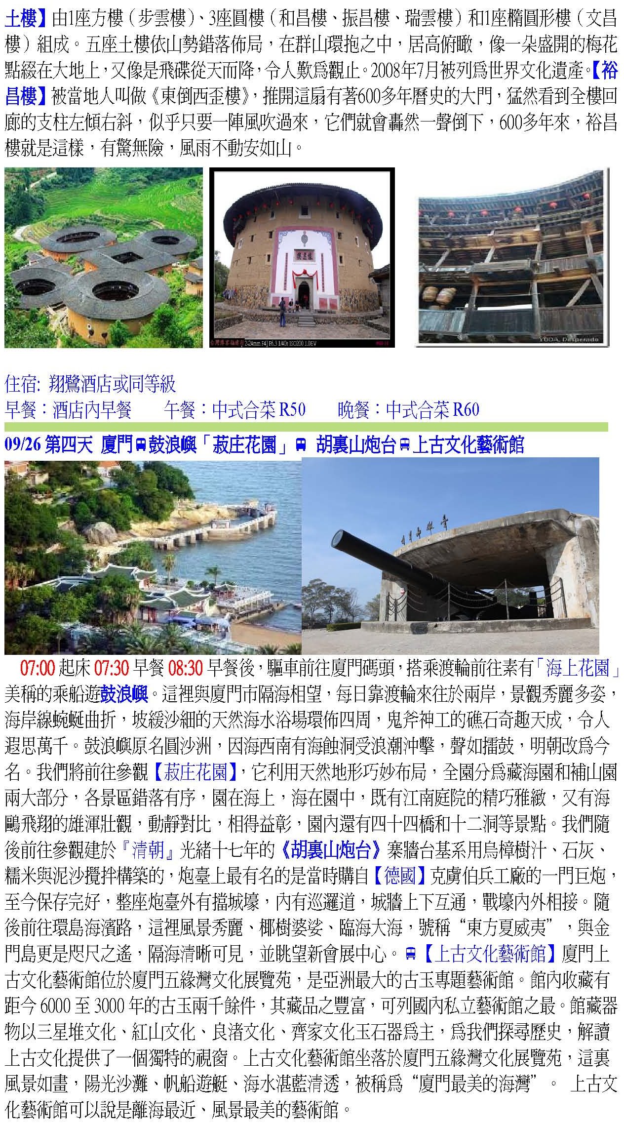 其他遊覽行程:參觀光緒十七年的胡里山砲台 廈門鼓浪嶼之旅 南靖土樓風情